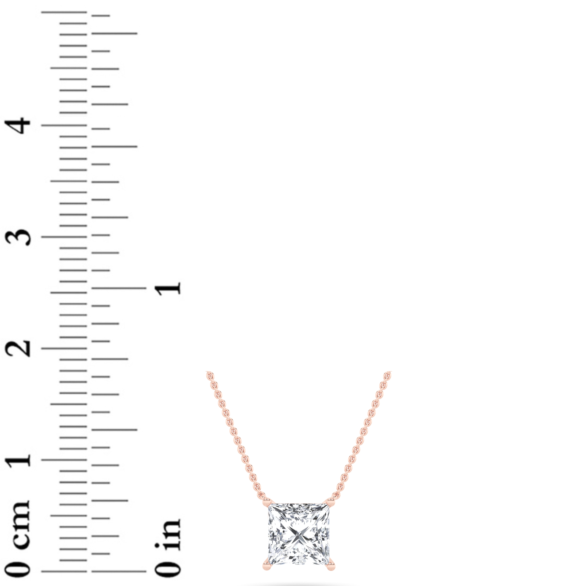 A striking princess-cut lab-grown diamond suspended from romantic 14K rose gold. F color with VS clarity — exceptional fire and brilliance.